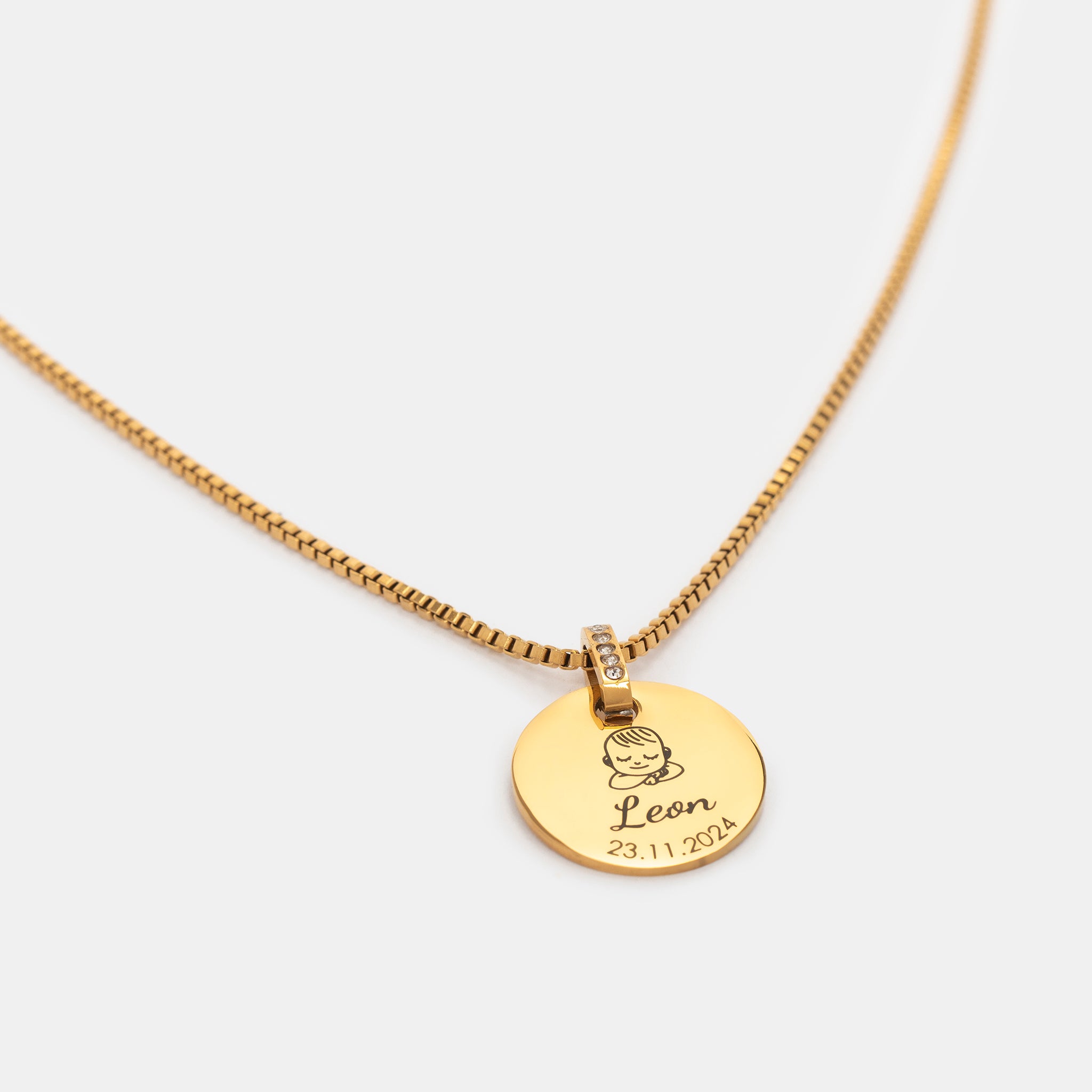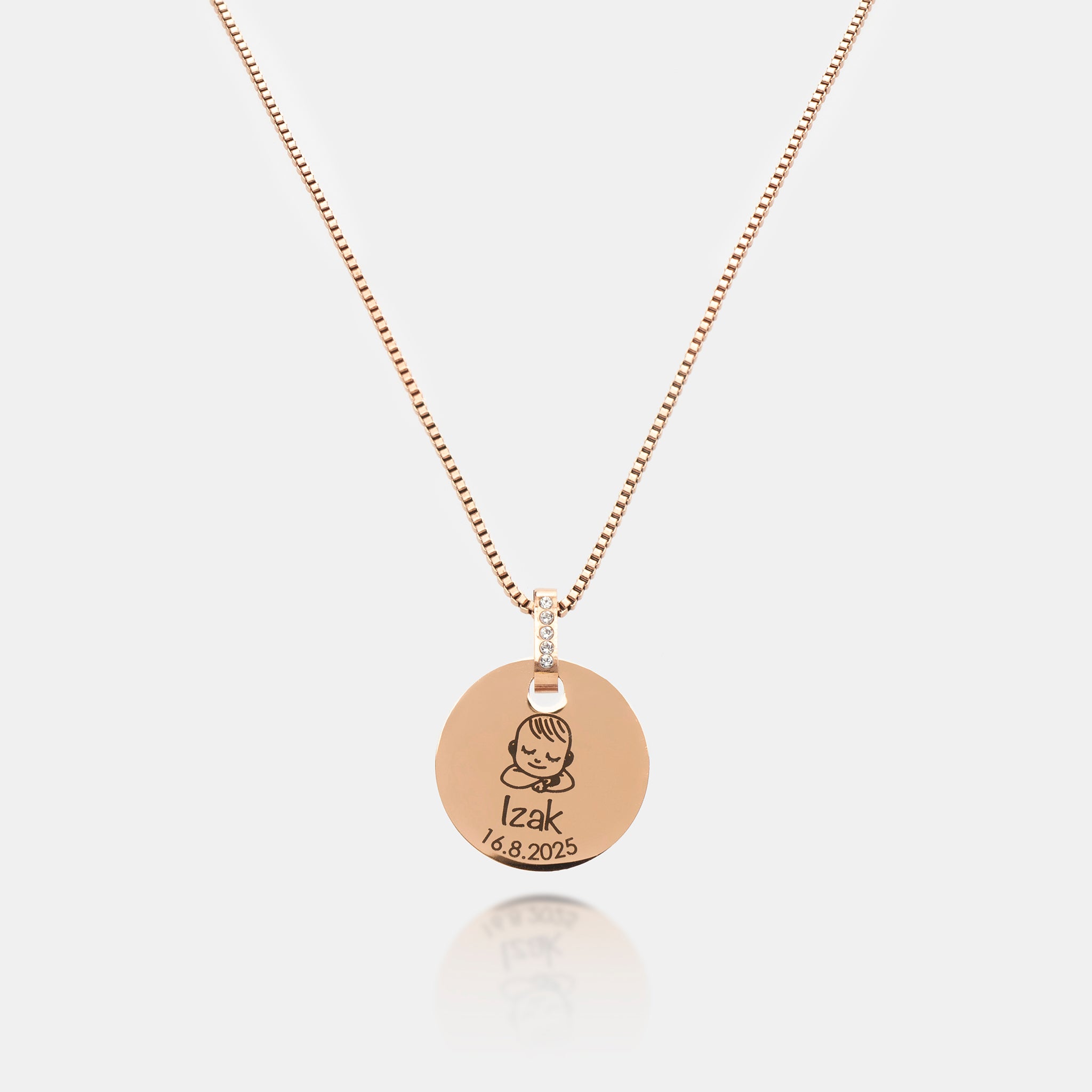 Celebrate motherhood with a personalized necklace engraved with the newborn’s name, birthdate, and a delicate baby illustration. A meaningful keepsake for any proud mom. Perfect for gifting.